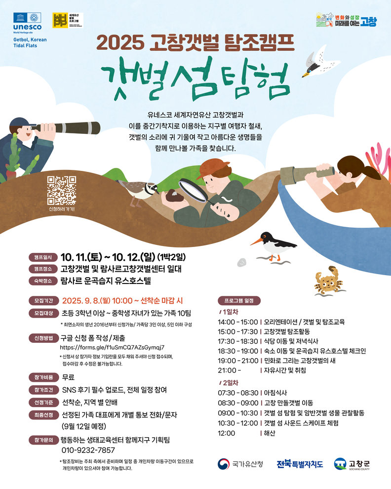 고창갯벌 탐조캠프 ‘갯벌 섬 탐험’의 참가 신청은 9월 8일 오전 10시부터 가능하며, 홍보 포스터에 안내된 QR코드를 통해 접수할 수 있다. 신청자가 많을 경우, 조기 마감될 수 있다.