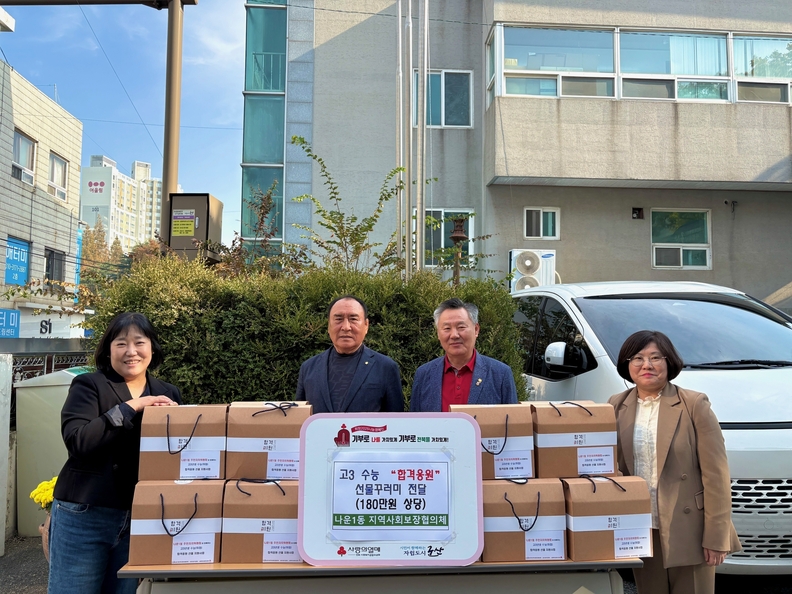 군산시 나운1동 지역사회보장협의체(공동위원장 이길란, 이삼석)는 지난 6일 관내 저소득가정 자녀 중 2026년도 대학수학능력시험을 앞둔 고 3년 수험생 합격을 응원하는 선물꾸러미를 전달하며 격려했다.