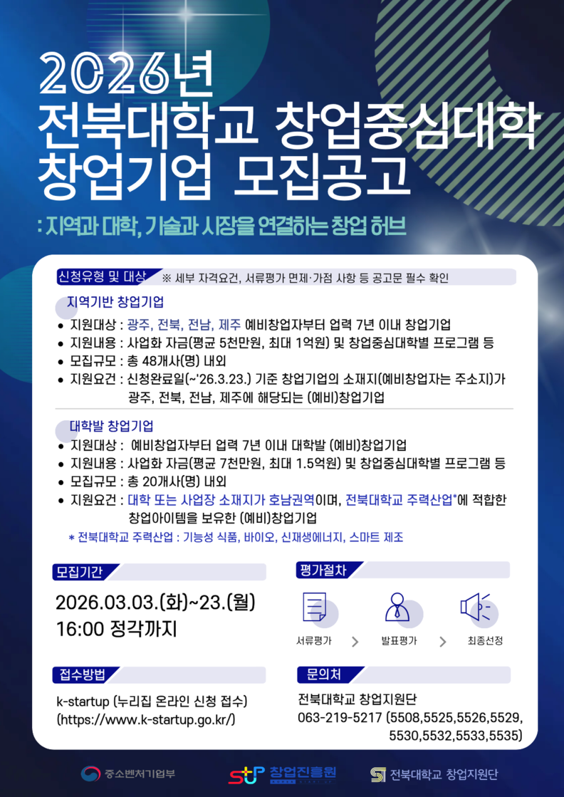 전북대학교 창업지원단이 지역 기반 혁신 창업기업 발굴과 창업 생태계 활성화를 위해 ‘2026년 창업중심대학 지원사업’에 참여할 (예비)창업기업을 모집한다고 6일 밝혔다.