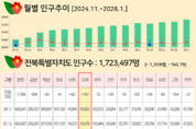김제시가 2026년 새해 시작과 함께 세 자릿수 인구 증가를 기록하며, 지난해의 가파른 상승세를 이어가고 있다. 행정안전부 주민등록 인구통계에 따르면 2026년 1월 말 기준 김제시의 주민등록인구는 81,823명으로 전월 대비 147명이 증가했다. 이는 자연감소(74명)를 상쇄하는 활발한 인구 유입의 결과로, 1월 한 달간 총 221명의 사회적 순유입이 발생하며 시가 추진해 온 다양한 인구 유입 정책이 실질적인 성과로 이어지고 있음을 보여준다. 특히 이번 인구 증가는 영유아(0~6세)가 23명, 청년층(18~39세)이 48명 증가하는 등 미래 세대의 유입이 두드러져 인구 구조의 질적 개선이 함께 이뤄지고 있다는 점에서 의미가 깊다. 이러한 성과는 시가 추진 중인 ▲전입장려금, ▲취업청년 정착수당, ▲청년부부 주택수당, ▲결혼축하금 등 정주 인구 유입을 위한‘생애주기별 맞춤형 지원 정책’이 실질적인 성과로 이어지고 있는 것으로 분석된다. 시는 지난해 말, 출산장려금 지원 대상 요건을 ‘부모 모두’에서 ‘부 또는 모 거주’로 완화하는 등 시민들이 피부로 느낄 수 있는 체감형 정책을 통해 인구 이탈을 방지하고 유입을 촉진하는데 총력을 기울여 왔다. 시는 이러한 긍